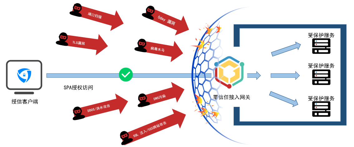 受保護(hù)的服務(wù)對(duì)未授權(quán)用戶(hù)及設(shè)備完全不可見(jiàn),無(wú)法通過(guò)端口掃描發(fā)現(xiàn)服務(wù)。 這些服務(wù)默認(rèn)在互聯(lián)網(wǎng)實(shí)現(xiàn)“隱藏“。嚴(yán)格的終端單包敲門(mén)機(jī)制, 確保只有認(rèn)證過(guò)的用戶(hù)及設(shè)備才能訪問(wèn)受保護(hù)服務(wù)。