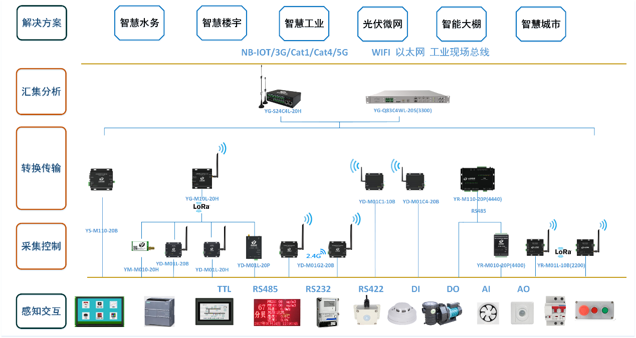 云涌科技智慧物聯(lián)網(wǎng)產(chǎn)品系列覆蓋采集控制、數(shù)據(jù)傳輸、數(shù)據(jù)分析等應用場景,同時支持以太網(wǎng)、RS485、RS232、RS422等現(xiàn)場總線,支持模擬量和數(shù)字量的輸入和輸出,也支持4G CAT1、4G CAT4、LoRa、WIFI等無線傳輸方式,能滿足現(xiàn)場復雜的通訊需求。