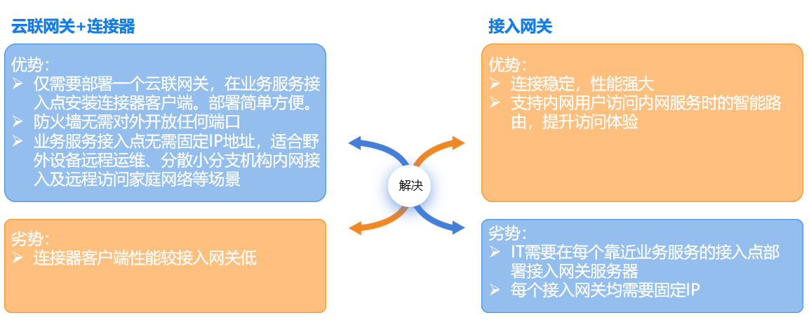 云涌遠(yuǎn)程辦公解決方案支持兩種內(nèi)網(wǎng)訪問模式:基于接入網(wǎng)關(guān)的訪問代理,以及基于云聯(lián)網(wǎng)關(guān)+連接器的內(nèi)網(wǎng)穿透??蛻艨梢愿鶕?jù)自身IT架構(gòu)及實(shí)際需求選擇適合的服務(wù)訪問模式。兩種模式可以同時存在。