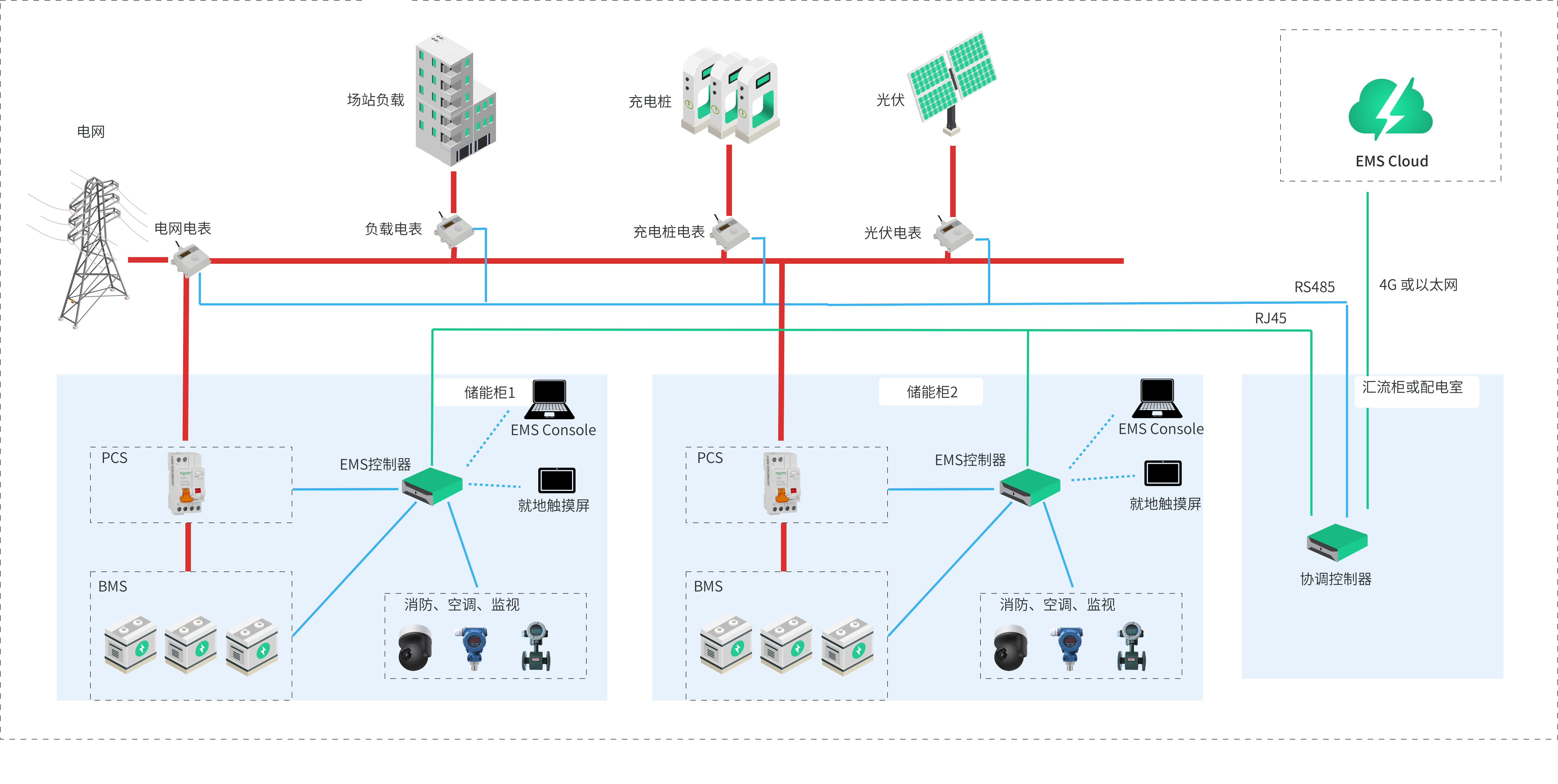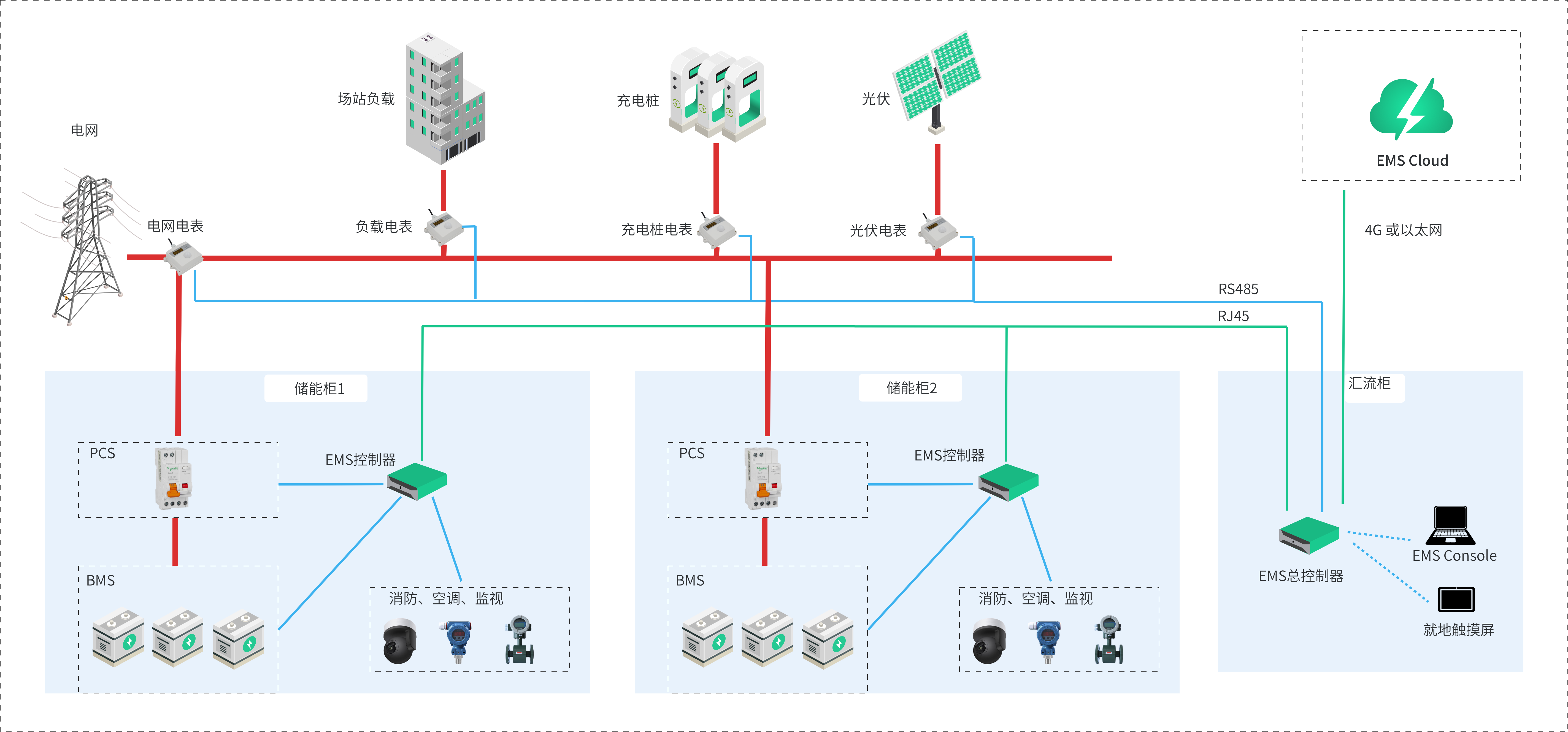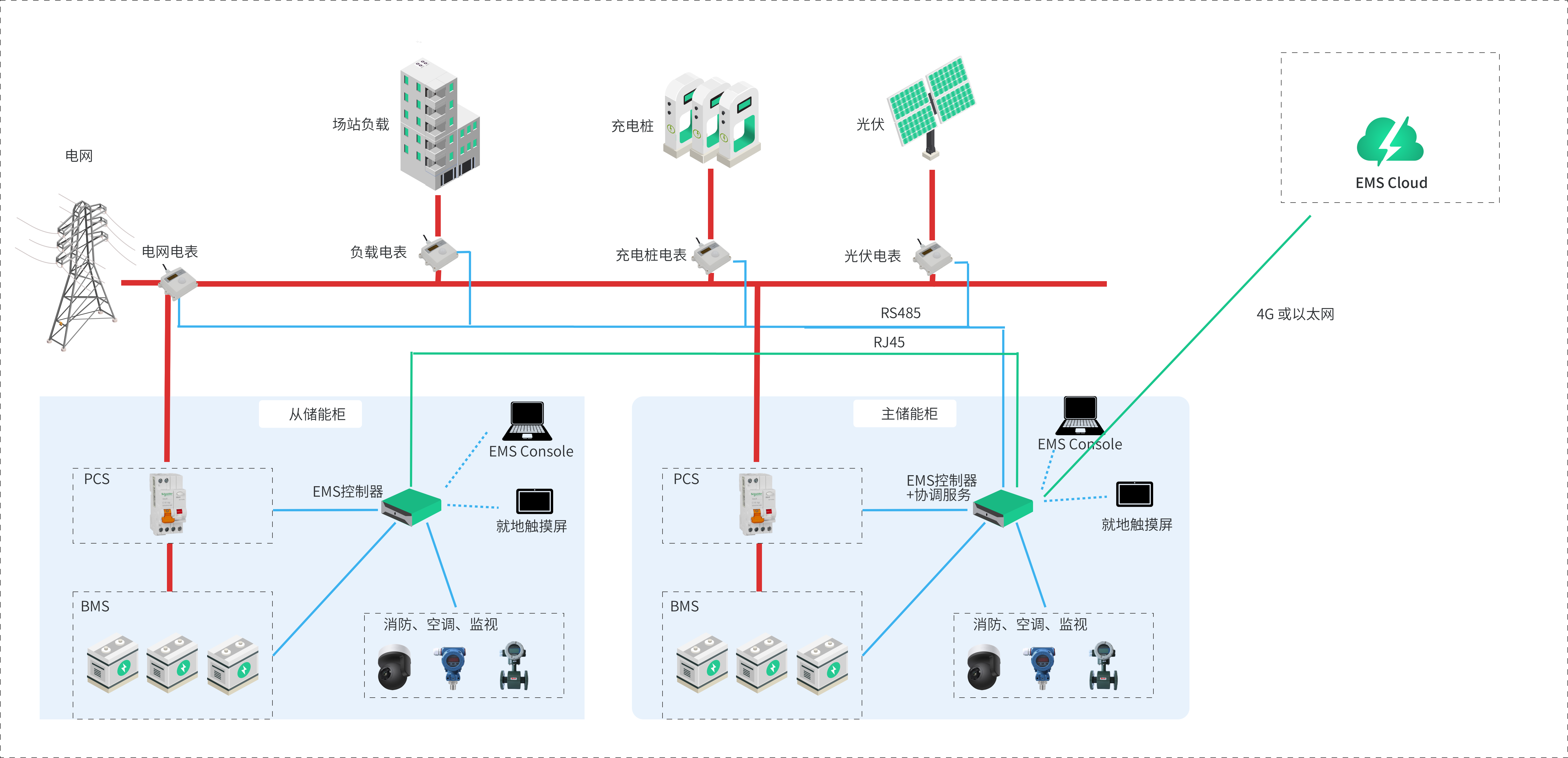 所有柜體內(nèi)只有一個控制器,并放置于主柜中,主柜EMS控制器通過以太網(wǎng)與所有從柜進行通訊交互,從柜中安裝采集或者轉(zhuǎn)換裝置,用于在主柜控制器與從柜各組件設(shè)備之間做數(shù)據(jù)轉(zhuǎn)發(fā)。