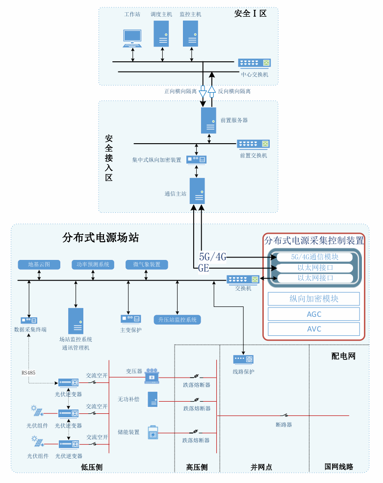 ???該裝置部署于分布式電源場站側(cè),基于無線專用通信網(wǎng)絡(luò)架構(gòu),集成縱向加密單元、無線通信模塊及 AGC/AVC 控制功能,通過電力專用通信通道接入生產(chǎn)控制大區(qū)安全接入?yún)^(qū),與調(diào)度主站建立安全通信鏈路,實(shí)現(xiàn)數(shù)據(jù)傳輸?shù)目煽啃耘c安全性。