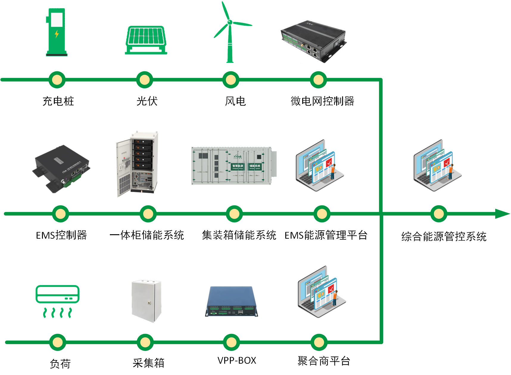 底層硬件——一體柜EMS控制器、微電網(wǎng)控制器、VPPBOX、規(guī)約轉(zhuǎn)換器、采集器、負(fù)荷控制器等。