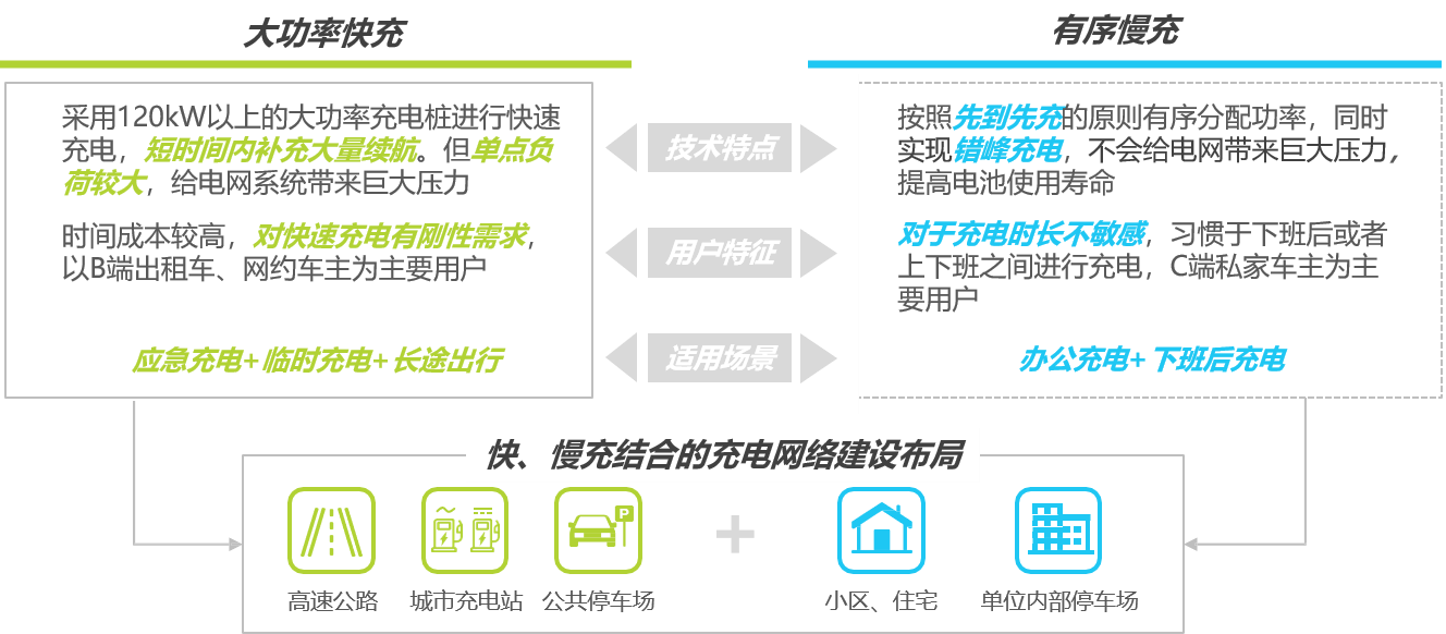 充電模式的有效發(fā)展:大功率直流快充成為剛需,充電難并不僅僅局限于充電基礎設施的數(shù)量與分布上,如何有效提高充電效率同樣重要,大功率快充和有序慢充體系的結合為未來充電模式的發(fā)展方向。