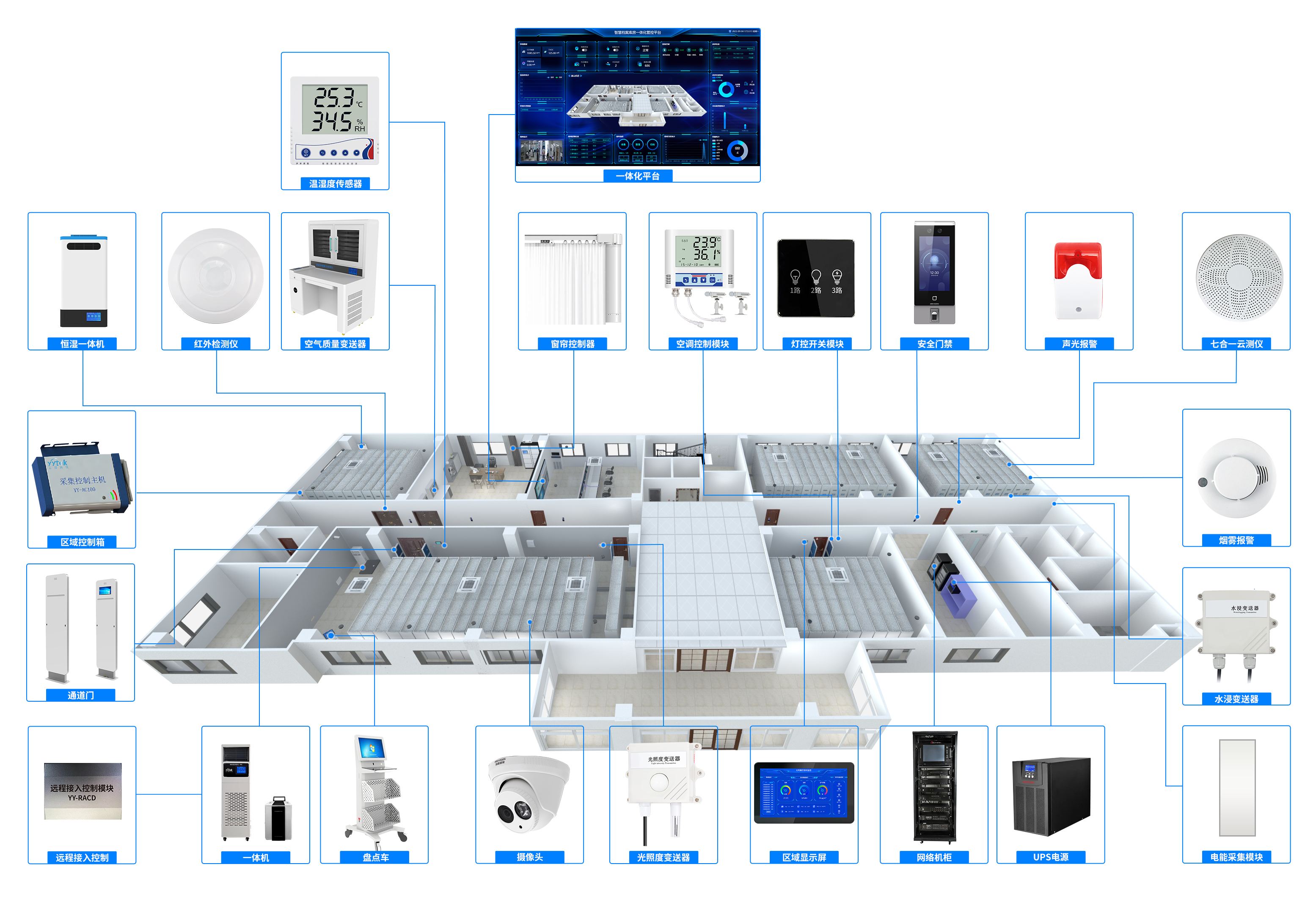 采集所有檔案室內(nèi)的溫度、濕度、漏水、煙霧、空氣質(zhì)量、人員侵入等數(shù)據(jù),并能夠通過控制空調(diào)、凈化一體機等設(shè)備,達(dá)到自動調(diào)節(jié)溫濕度及空氣凈化的目的。