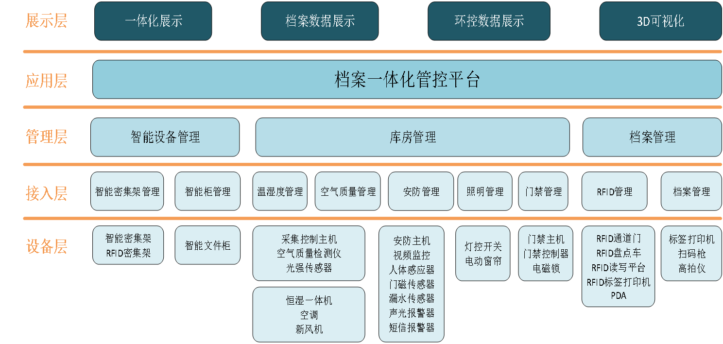 通過一套系統(tǒng)實現(xiàn)庫房內(nèi)實體檔案管理設(shè)備、檔案存儲設(shè)備、檔案庫房環(huán)境監(jiān)控設(shè)備、檔案庫房安全防范設(shè)備等的統(tǒng)一管理。